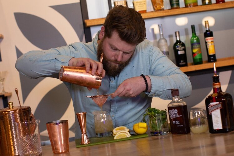 Rod Hatfield – Andrew Lazear, co-creator of The Market Bar, works on making handcrafted, unique cocktails.with fresh ingredients.