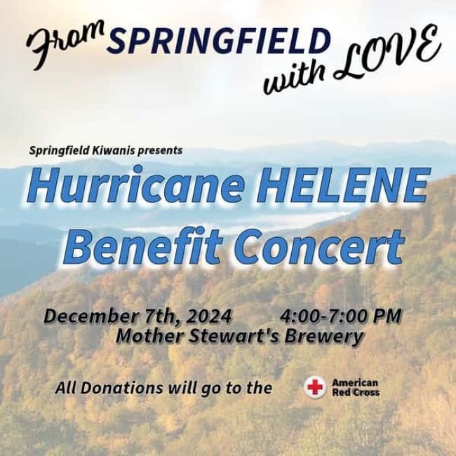 The Kiwanis Club of Springfield will be stationed at the front door of Mother Stewart’s to accept donations on behalf of the American Red Cross via cash, check, or credit card from 3:15 p.m.- 7 p.m. Funds raised at the event will be used for vital relief services to Hurricane Helene affected areas provided by the American Red Cross.