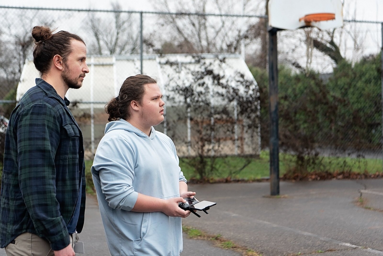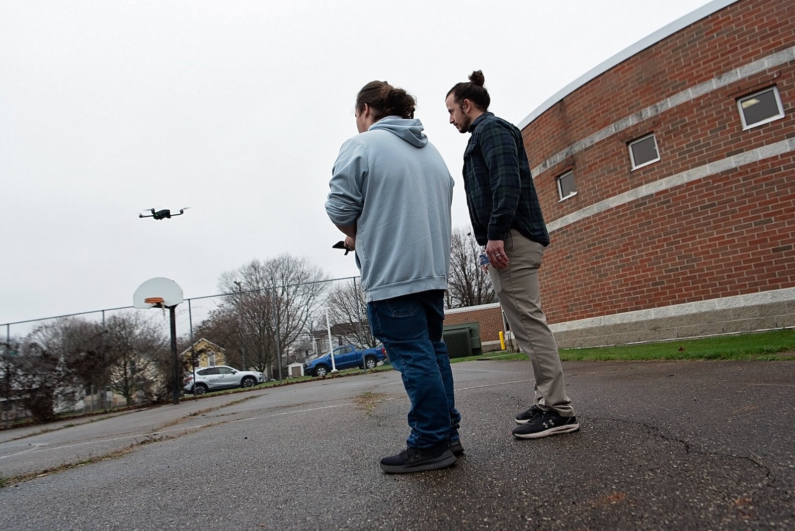 Students are able to take turns flying three drones, ranging in size and specifications. During the week, students complete their coursework, and every Friday, they are able to use the controls and manipulate the drones in flight. Students fly through obstacles like hula hoops, while their peers help direct them and act as visual observers.