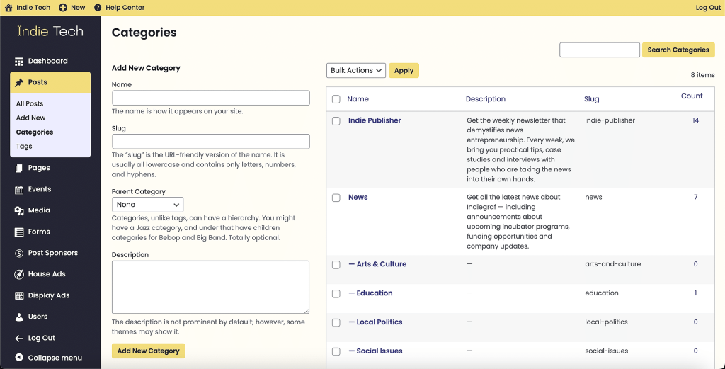 To manage your categories, go to Posts > Categories in the dashboard menu. On the right, you will see a list of all your current categories including their Name, Description, Slug, and Count (total number of posts assigned to that category). On the left, you will see a series of fields that allow you to add a new category.