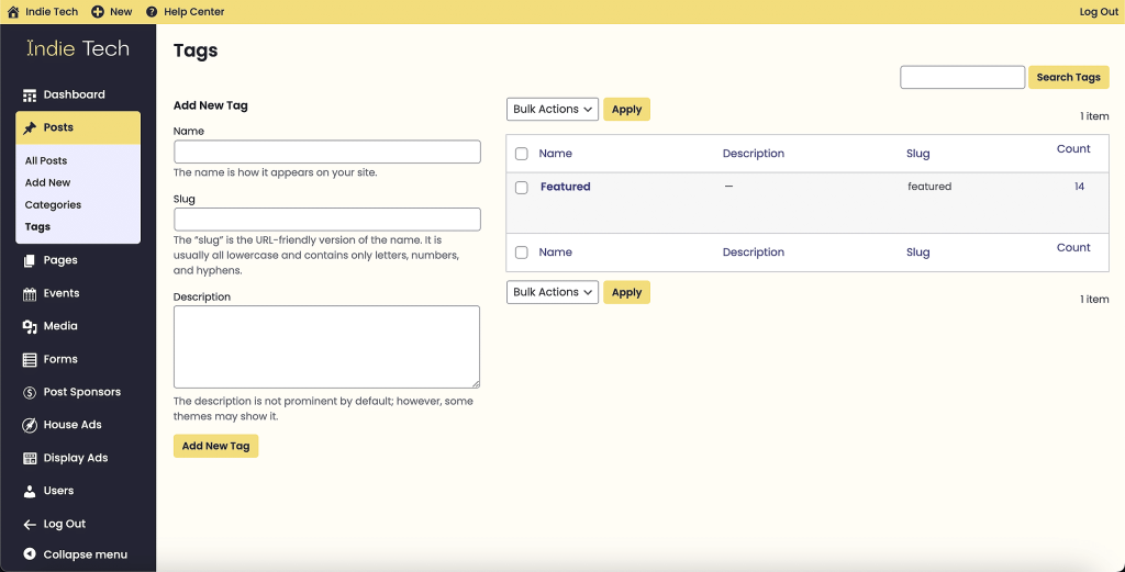 To manage your tags, go to Posts > Tags in the dashboard menu. On the right, you will see a list of all your current tags including their Name, Description, Slug, and Count (total number of posts assigned to that category). On the left, you will see a series of fields that allow you to add a new tag.