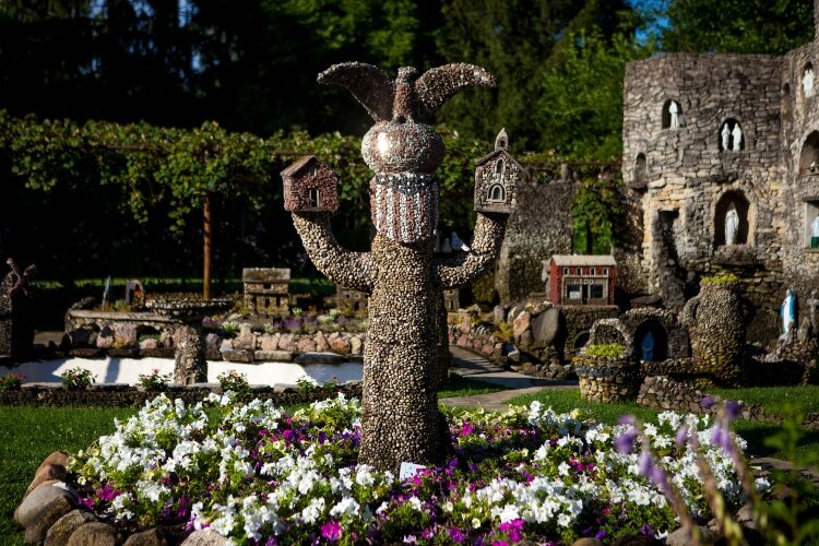 Every day, people from Ohio, other states, or even other countries stroll the garden’s walkways to gaze upon sights such as the Tree of Life, a 7-foot-tall concrete topiary studded with mixed stones and gravel, with two branches holding a schoolhouse and a church and topped by an eagle with outstretched wings.