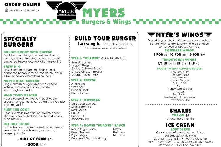 Myers Burgers & Wings will be open from 4 to 9 p.m. Monday through Wednesday and 11 a.m. through 10 p.m. Thursday through Saturday. A takeout/delivery menu is available on the restaurant website.