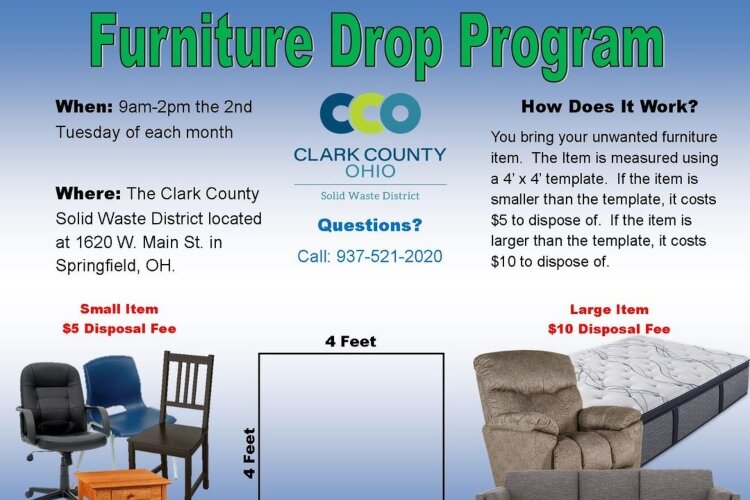 The Furniture Drop will be offered every second Tuesday of the month, from 9 a.m. to 2 p.m. at the District’s warehouse facility, 1620 W. Main St. Residents can drive though the facility and have their items unloaded. Fees depend on the size of each item. Anything 4 feet by 4 feet or smaller will cost $5; anything larger will be $10. Examples of small items would be desk chairs or end tables. Large ones would include couches, easy chairs, or mattresses. Bauer says the fees will cover the costs to dispose of the items at a landfill.
