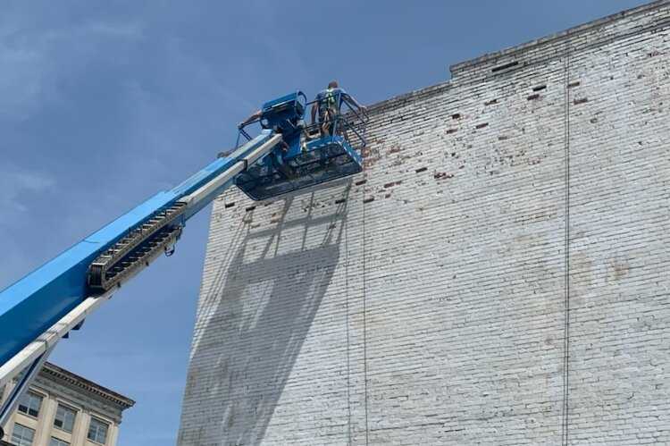 Though the wall on the back of The State Theater was available to be painted, it needed repaired and prepped in order for Columbus-based artist Jeremy Jarvis and volunteers to jump in and get to work, Wojcik says.