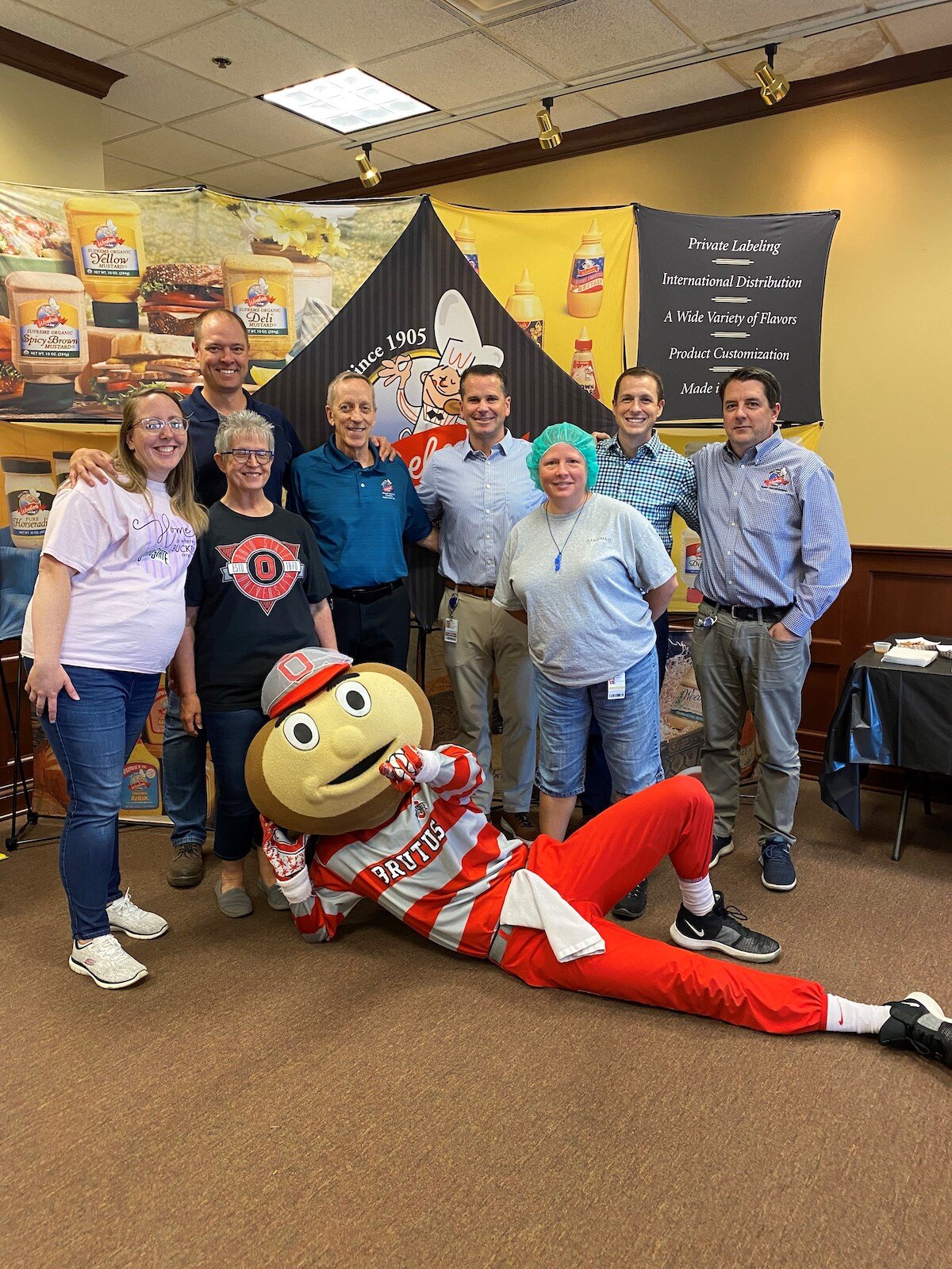 Members of the Woeber Mustard Company’s team with Brutus Buckeye.